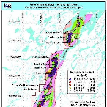 Labrador Gold undertook the first systematic exploration for gold in the region with preliminary work completed in the fall of 2017. A total of 270 high-density lake sediment samples and 1,332 C-horizon soil samples were collected. Results indicated district scale gold (up to 0.93g/t)in soil samples over a 40 km strike length of the Florence Lake Greenstone Belt. Anomalies are most commonly associated with contacts between ultramafic metavolcanic rocks and surrounding rocks.