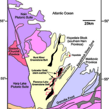 The Hopedale property comprises 998 claims in five licenses covering 249 square kilometres of the Florence Lake greenstone belt. Claims are just 30 km from the coastal community of Hopedale which has daily air service from Happy Valley-Goose Bay. The eastern portion of the Florence Lake greenstone belt lies along tidewater southwest of Hopedale.
