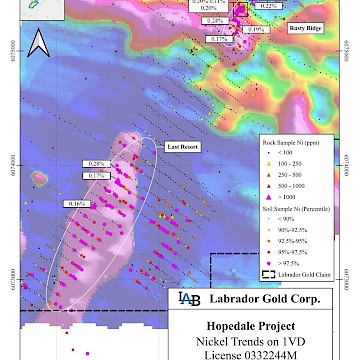 Work during 2022 found significant nickel anomalies in soil and rock at an area named Rusty Ridge. The anomalies occur in ultramafic rocks indicating potential for magmatic nickel style mineralization. A total of 14 grab samples of rock assayed over 0.1% Ni and included values up to 0.28% Ni while nickel values in soil up to 2,271ppm (0.23%) show a significant northeast-southwest trend extending the anomalous area over 550m. Approximately 1.2km south of Rusty Ridge, anomalous nickel in soil samples was outlined over a 1.6km strike length and is coincident with a significant magnetic high. Six of the samples assayed over 1,000ppm (0.1%) Ni with a high of 2,271ppm (0.23%) Ni. Limited rock sampling showed assays of 0.28%, 0.17% and 0.16% Ni in grab samples in this area named Last Resort