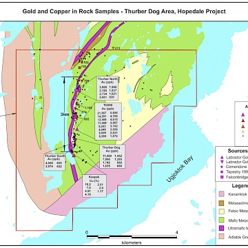 Eight occurrences have been identified on the Hopedale project to date reflecting multiple mineralization styles including orogenic gold, magmatic Ni sulphide, copper-silver vein and Zn-rich volcanogenic massive sulphide.